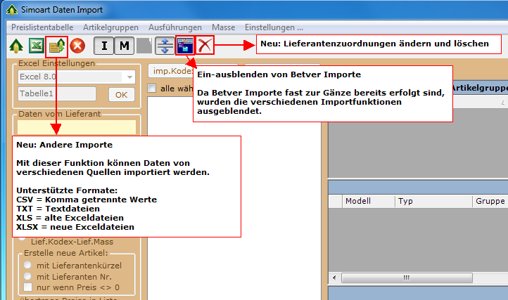 Simoart ist nun in der Lage Artikel und Preise von den unterschiedlichsten Quellen zu importieren. Folgende Dateiformate werden unterstützt: