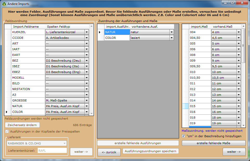 In der Spalte "sel" können Sie bestimmen ob die Zuordnung im Import gewählt sein soll oder nicht.
