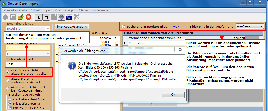 Es können problemlos auch die Bilder der Artikel zugleich importiert werden. Andernfalls können die Bilder nachträglich einzeln im Programm Artikel erfasst werden. Zum automatischen Import der Bilder sind folgende Voraussetzungen erfordert: