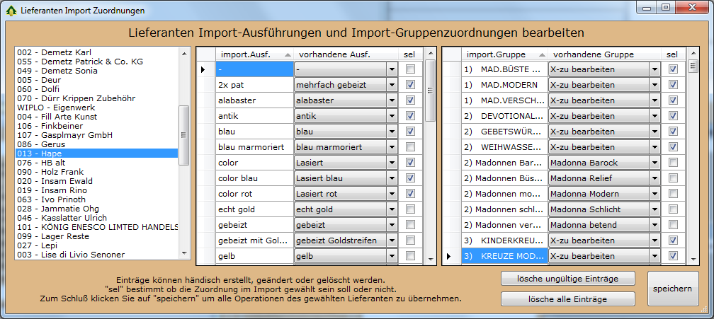 Meistens werden Lieferantenzuordnungen einfach gelöscht, weil sie ungültig sind (Sie oder der Lieferant haben Ausführungen und/oder Artikelgruppen geändert oder gelöscht). Sie können aber durchaus neue Zuordnungen erstellen oder bestehende ändern.