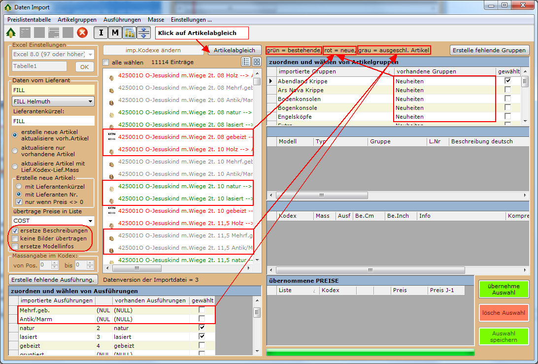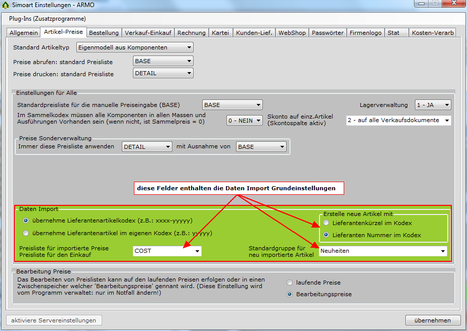 vorh.Artikel" ist für einen Daten Neuimport zutreffend. Die Einstellungen "mit Lieferantenkürzel"
