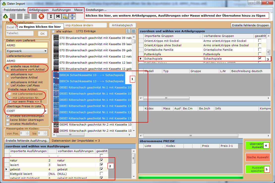 - Import speichern: "übernehme Auswahl" klicken (4) und die importierte Daten kontrollieren. Wenn alles