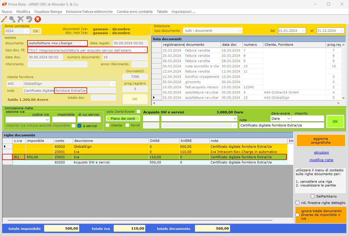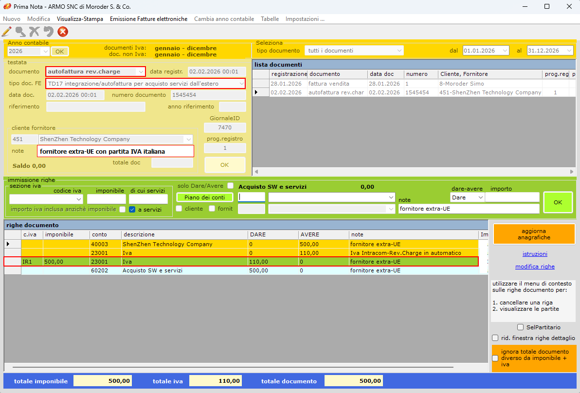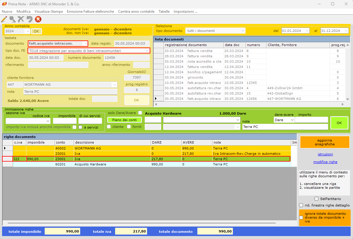 Vedi nella seguente immagine un esempio di registrazione in PrimaNota