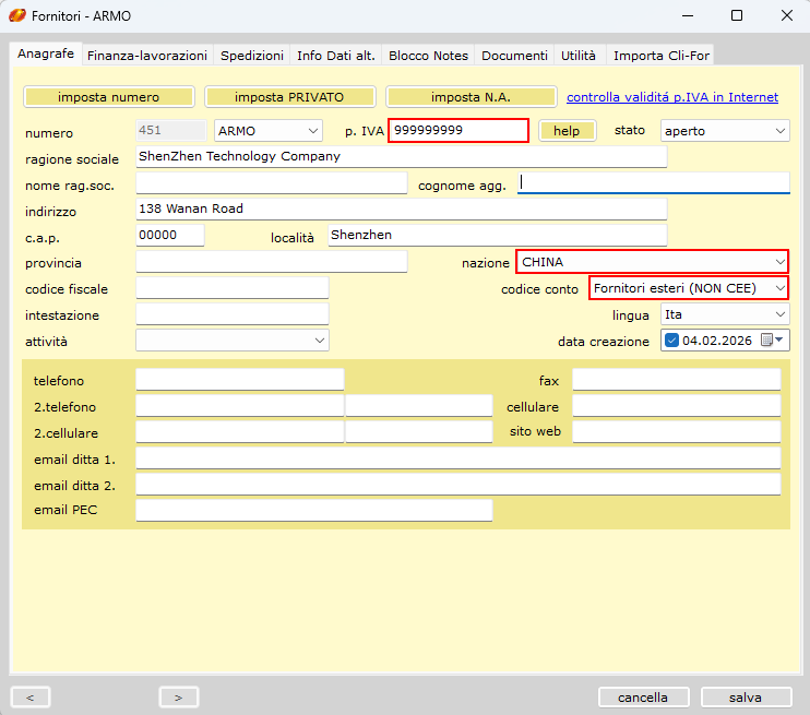 Il problema che si pone, nella specifica situazione in esame, è che i codici TD17, TD18 e TD19, essendo creati specificatamente per operazioni con l’estero, segnaleranno come errore l’inserimento del numero di partita IVA italiana per il relativo campo del fornitore.