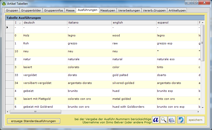 Die Ausführungen werden im Artikel Programm benötigt. Wir raten die Hauptausführungen mit einer einstelligen Nummer zu versehen. Andere Ausführungen können mit 2 oder 3 Stellige Nummer versehen werden. Die Reihenfolge erfolgt alphabetisch, nicht numerisch.
