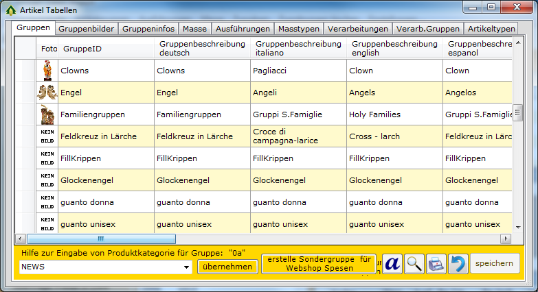 Die Artikelgruppen werden im Artikel Programm benötigt. GruppeID darf keine Sonderzeichen (;",/ '*?#`´!$+=&\%) enthalten und kann nachträglich nicht mehr geändert werden. Die Beschreibungen hingegen können Sonderzeichen enthalten und jederzeit geändert werden. Die Bilder der Gruppen werden zurzeit nur im Webshop benötigt.
