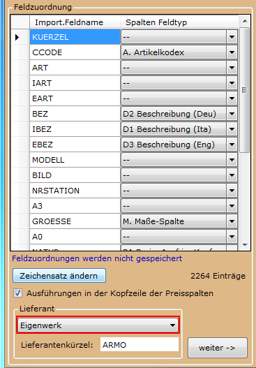 Nachdem Sie die "Artikel.csv" Datei geöffnet haben, nehmen Sie die fehlenden Feldzuordnungen vor und wählen als Lieferant "Eigenwerk".