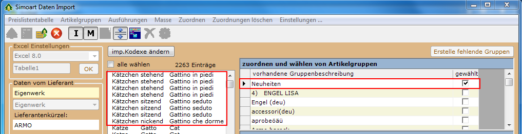 Wenn Sie die Aufteilung der Artikel in den verschiedenen Gruppen im Moment nicht vornehmen wollen, können Sie alle Artikel (Klick auf "alle wählen") in einer Gruppe (z.B. Neuheiten) importieren. Die Aufteilung können Sie nachträglich und komfortabel mit der Funktion "Artikelgruppen" im Programm Artikel vornehmen.