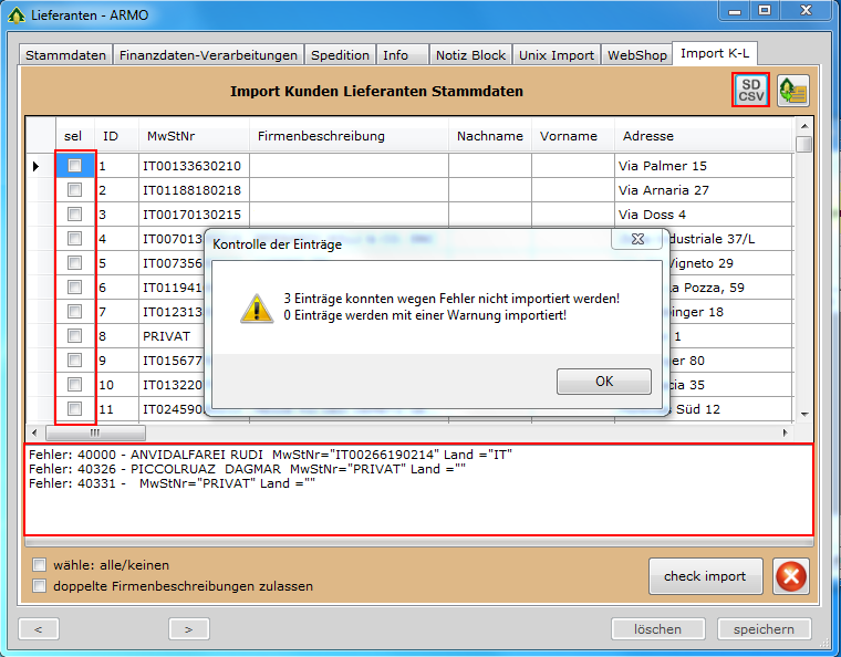 In diesem Beispiel wurden die Lieferanten importiert. Lieferant 40000 wird nicht akzeptiert, bei Lief. 40326 und 40331 fehlt die Länderangabe.
