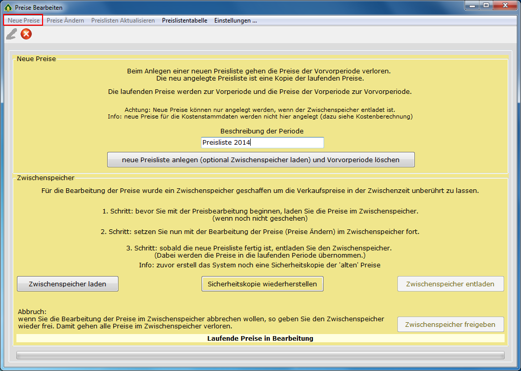 Klicken Sie "neue Preisliste anlegen ...". Laden Sie sofort den Zwischenspeicher sodass Sie die Preise in aller Ruhe ändern können, ohne die Verkaufspreise zu beeinträchtigen.