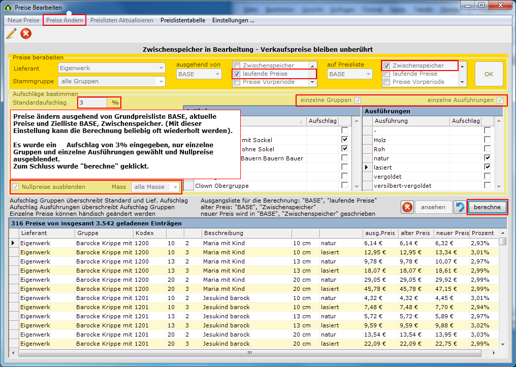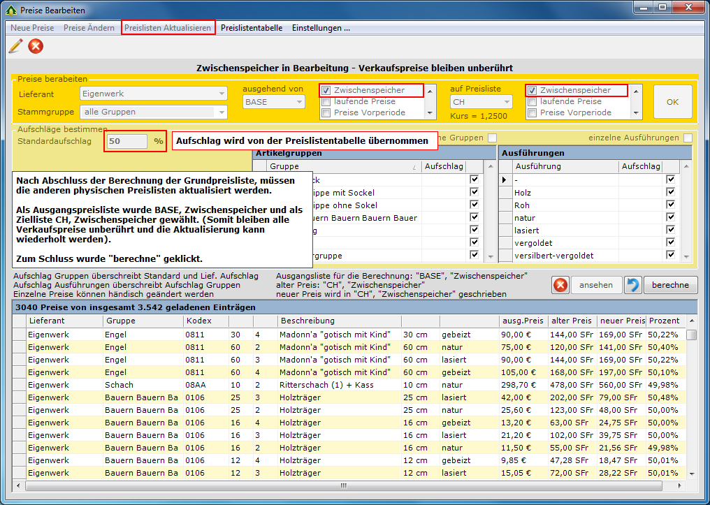 Mit dieser Funktion können Sie die Preise vor und nach dem Berechnen ansehen. Sinnvoll ist die Kontrolle der Preise mit den jeweiligen Aufschlägen in Prozent bevor Sie diese in Kraft setzen.