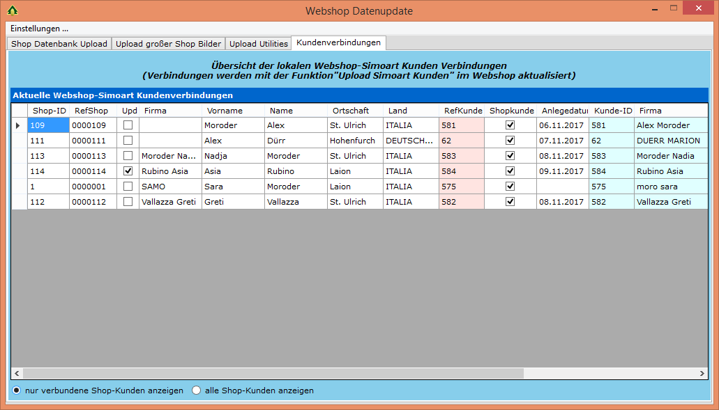 Sollte Etwas mit den Shop- und Simoart-Kundendaten Verbindungen nicht nachvollziehbar sein, so können die Details der Kunden Verbindungen abgerufen werden - siehe Bild.