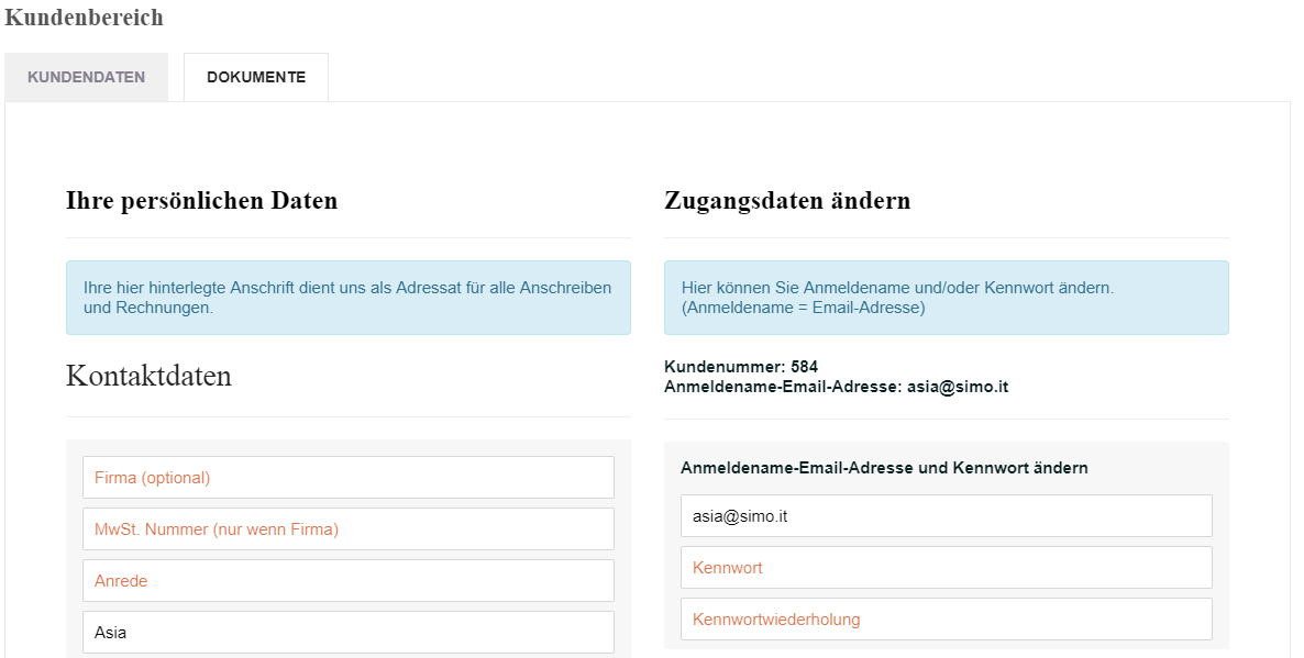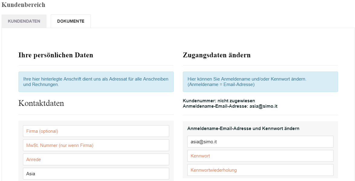 Nach erfolgreicher Anmeldung als verlinkter Shop-Kunde werden folgende Simoart-Kundendaten im Shop übernommen