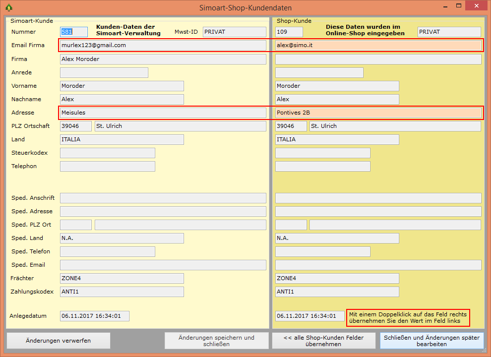 Übernahme der Änderung erfolgt immer von rechts nach links. Für Änderungen einzelner Felder, genügt ein Doppelklick auf ein rotes Feld im rechten Bereich, um alle Änderungen zu übernehmen genügt ein Klick auf "alle Shop-Kunden Felder übernehmen". Mit "Änderungen verwerfen" werden alle Felder im linken Bereich auf den Ausgangswert zurückgesetzt.