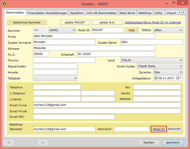 Hier genügt es dem Link "Shop-ID" zu folgen, um das "Simoart-Shop-Kundendaten" Programm aufzurufen.