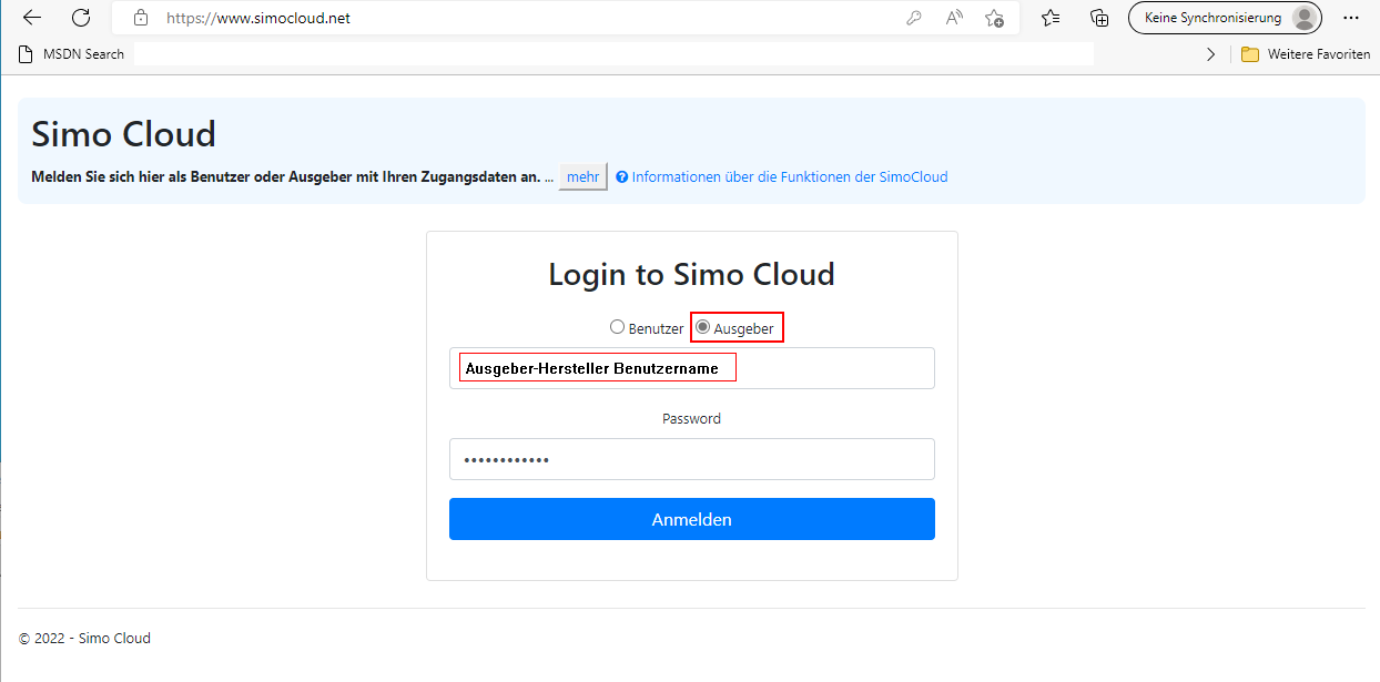 Melden Sie sich in der Simo-Cloud an https://www.simocloud.net/. Die Zugangsdaten bekommen Sie mit dem Kauf des Simo-Cloud Dienstes.
