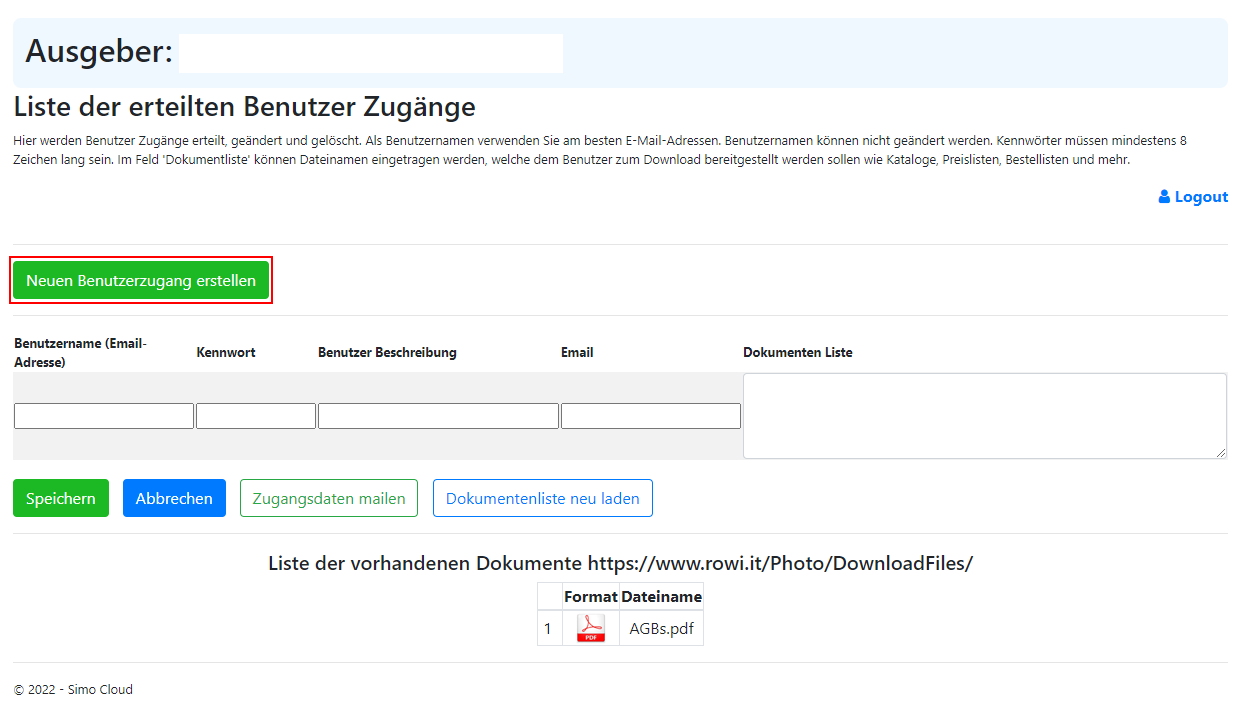 Nach der Anmeldung ist die Liste der Benutzer Zugänge erstmals leer. Beginnen Sie mit "Neuen Benutzer erstellen". Geben Sie die E-Mail Adresse Ihres Kunden, Kennwort (mindestens 8 Zeichen mit Buchstaben, Nummern und Sonderzeichen), die Firmenbeschreibung und nochmals die E-Mail Adresse ein. Um den Benutzer anzulegen, genügen diese Felder. Die Dokumentenliste können Sie auch später ergänzen. Wahrscheinlich ist die Liste der vorhandenen Dokumente auch leer.