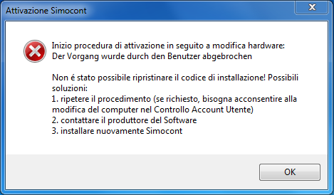 Se la risposta alla richiesta di modifica del computer nel Controllo Account Utente é negativa oppure se si verifica un errore nel ripristino del codice di installazione, allora verrį visualizzato il seguente messaggio