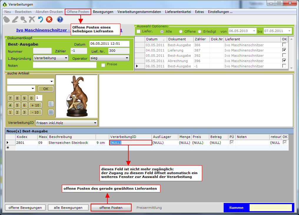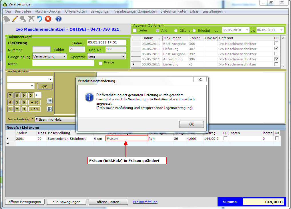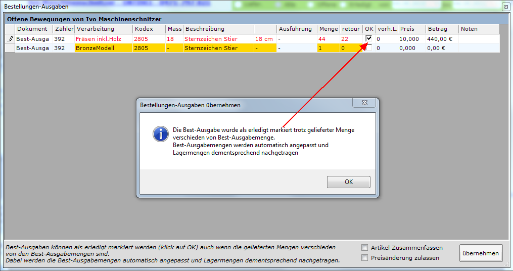 Als Nächstes haben wir in der Zeile Best-Ausgabe 366 die gesamte Menge mit einem Klick auf OK übernommen: nur die Übernahme einer gesamten Lieferungen kann die Verarbeitungs-Änderung auf die Best-Ausgabe übertragen. Es folgt das Beispiel der Verarbeitungs-Änderung