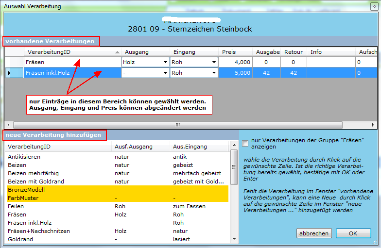 Fenster zur zwingenden Auswahl der Verarbeitung. Nur vorhandene Verarbeitungen