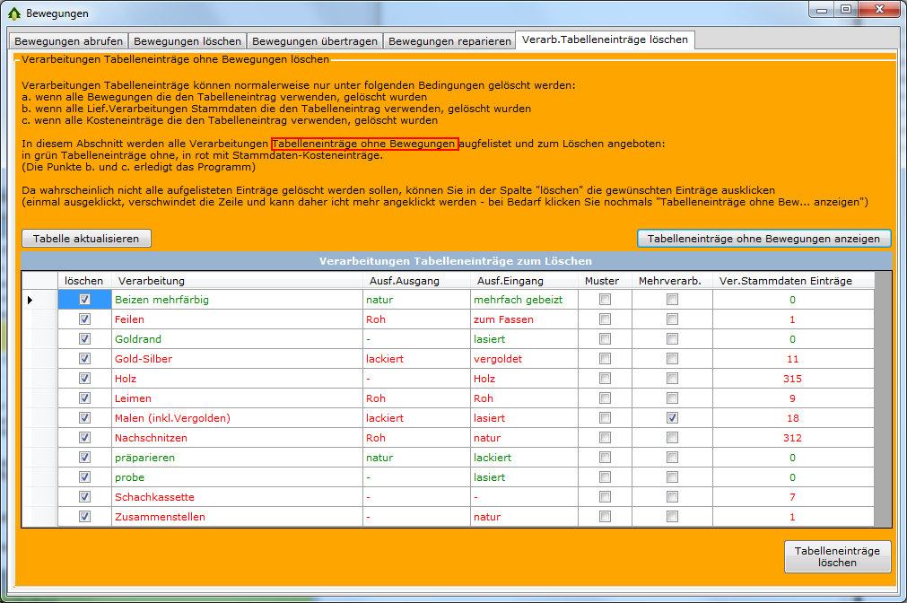 Voraussetzung für das Löschen einer Verarbeitung in der Tabelle Verarbeitungen (sodass sie nirgendwo mehr aufscheint), ist das Eliminieren aller Bewegungen die diese Verarbeitung enthalten. Die Operation muss händisch - Lieferant pro Lieferant - durchgeführt werden: am einfachsten geht das mit Hilfe der Funktion "Bewegungen löschen" (2.Raster) nachdem alle betroffene Bewegungen geschlossen worden sind. Erst dann wird die gewünschte Verarbeitung zum Löschen angeboten (siehe rote Einrahmung).