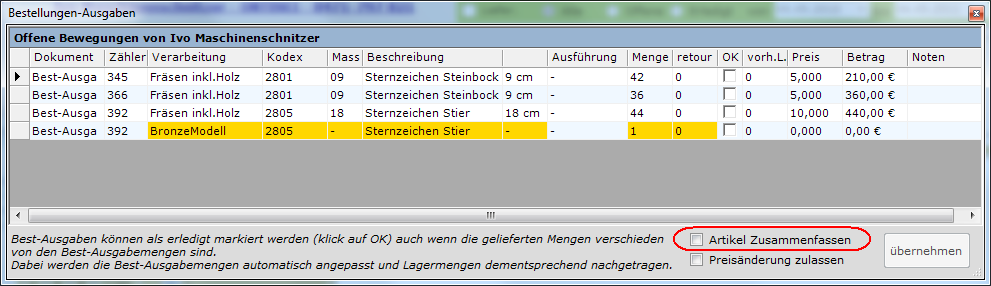 Fenster zur Auswahl von gelieferte Ware. Ein Klick auf "Artikel zusammenfassen" ergibt
