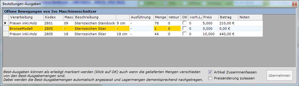 Fenster zur Auswahl von gelieferte Ware zusammengefasst. Ein Klick auf OK der