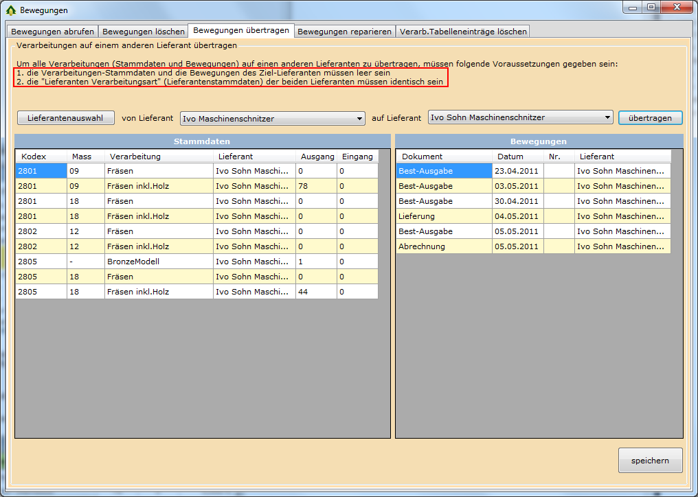 Im folgendem Bild ist ein Beispiel für die neuen Funktion "Bewegungen auf einem anderen Lieferanten übertragen" angeführt