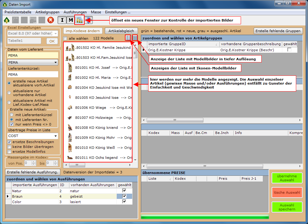 Hauptunterschied zur früheren Version ist die Auswahlliste: jetzt werden nur mehr die Modelle angezeigt (früher waren es alle Artikel - jedes Modell in allen Größen und Ausführungen). Da die aufwändige Auswahl einzelner Artikel entfällt, müssen ev. unerwünschte Größen nachträglich im Artikelprogramm gelöscht werden. Unerwünschte Ausführungen können, wie bisher, einfach für den Import nicht gewählt werden