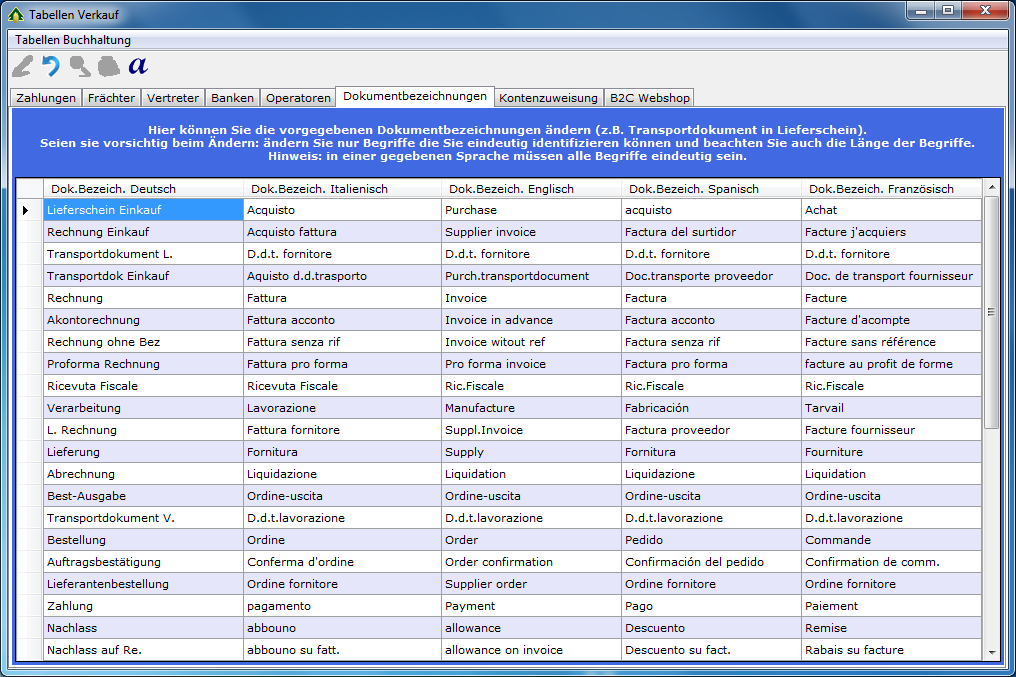Die Dokumentbezeichungen in Simoart waren bisher fix im Programm gespeichert. Nun wurden diese Bezeichungen dem Benutzer zugänglich gemacht. Hier sehen Sie die Tabelle der Dokumentbezeichnungen: jeder Eintrag kann beliebieg abgeändert werden. Bei der Änderunrung der Begriffe, beachten Sie dass die Länge der Bezeichnungen auf das Druck-Layout des jeweiligen Domukents abgestimmt ist: zu lange Beschreibungen werden abgeschnitten und im schlimmsten Fall wird die Druck-Grafik beeinträchtigt.