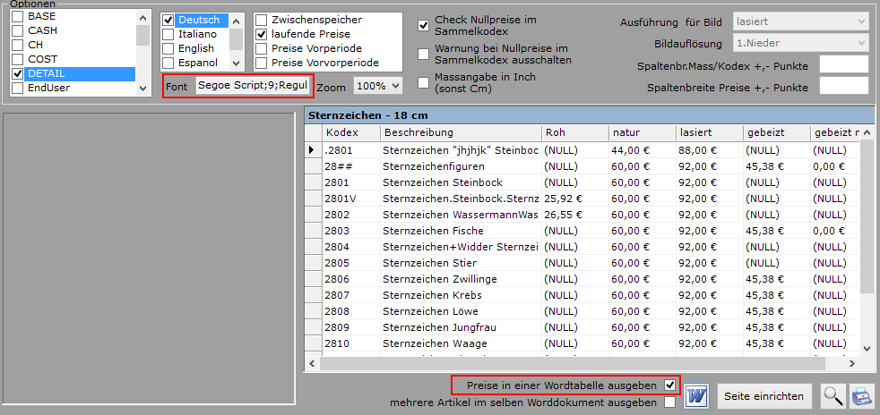 "Preise in einer Wordtabelle ausgeben" und die zugehörige Font Einstellung sind neu.