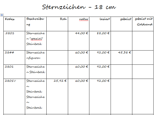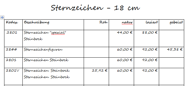 Im Gegensatz zur Ausgabe der Preistabelle als Bild, wirkt die Wordtabelle eher "spartan": die grafische Gestaltung der Tabelle müssen Sie nun selbst vornehmen. Sehen ein Beispiel einer minimalen Tabellengestaltung in folgenden Bildern. Die Bearbeitung der Tabelle führen Sie im Wordprogramm aus.