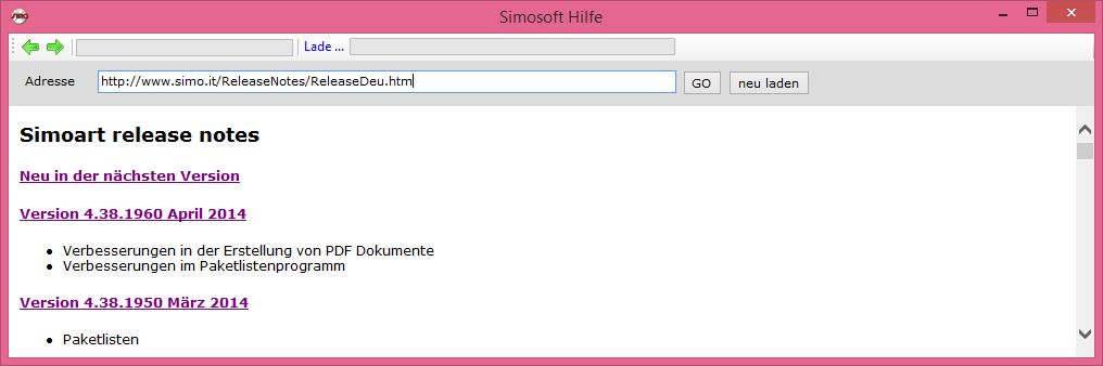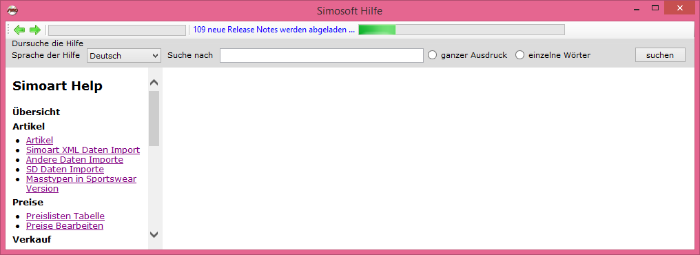 Die Hilfe umfasst Infos und Bilder zur Benutzung des Simosoft Programms. Die Hilfe besteht aus HTML Seiten und wird zusammen mit dem Simosoft Produkt auf dem Computer installiert. Die Hilfe finden Sie in allen Simosoft Produkten unter dem Menupunkt "Info". Beim jedem Start der Hilfe werden alle fehlenden Neuheiten - sogenannte Release Notes - vom Internet abgeladen um den gesamten Informationsbestand für die Suchfunktion bereit zu stellen.