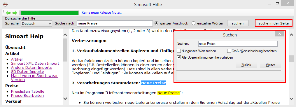 In der Hilfe ist eine nützliche Suche eingebettet: Sie können nach Ausdrücken oder einzelne Wörter suchen. Die Suche erfolgt auf alle Hilfe und Neuheiten Dokumente.