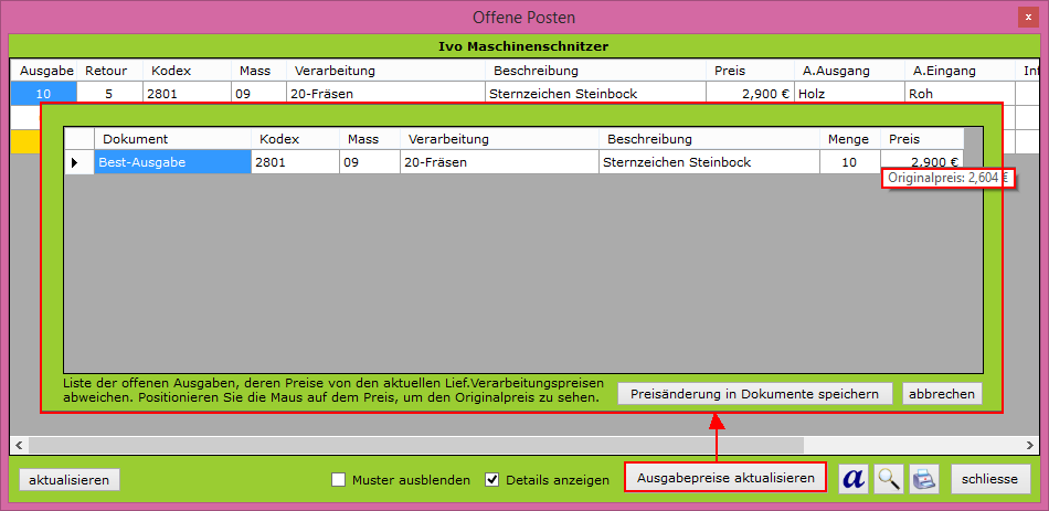 Klicken Sie auf "Ausgabepreise aktualisieren" um den Vergleich der Dokumentpreise mit den aktuellen Lieferantenverarbeitungspreisen zu starten. Alle gefundenen Preisunterschiede werden im rotmarkierten Fenster angezeigt. Die Preise in der Liste sind bereits aktualisiert. Den Originalpreis können Sie sehen indem Sie die Maus auf dem Preis positionieren - siehe Bild.