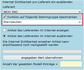 Wenn Sie einen Webshop betreiben und die Artikel eines bestimmtem Lieferanten gezielt ausschließen wollen, dann benützen Sie folgende Funktion. Sie können die Funktion selektiv auf bestimmte Artikelgruppen anwenden.
