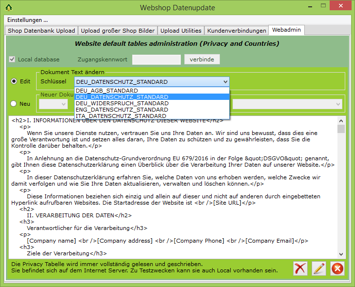 ACHTUNG: diese Funktion ist - im Moment - nur in der STANDARD Fassung für Website-Entwickler zugänglich. In Zukunft könnte hier eine personalisierte Fassung ihrer Datenschutz, Widerrufsrecht und AGB's Texte frei für Änderungen gespeichert werden.