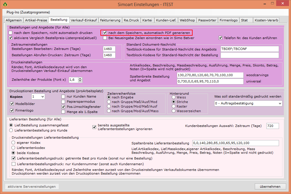 Im Programm Bestellungen wird nach dem Speichern automatisch die Bestellung im PDF Format erstellt, wenn die dementsprechende Einstellung aktiviert ist. Siehe folgendes Bild