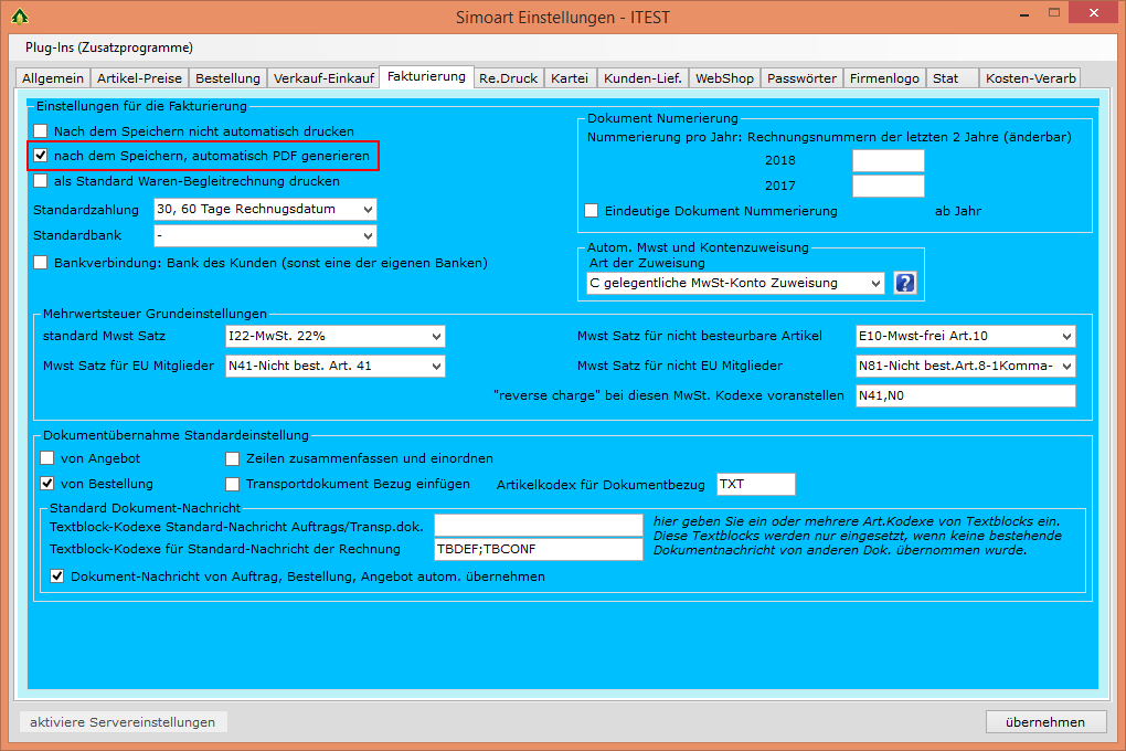 Dasselbe gilt für die Rechnungen im Fakturierungsprogramm. Anbei die Einstellung für die die automatische Generierung der PDF-Rechnung.