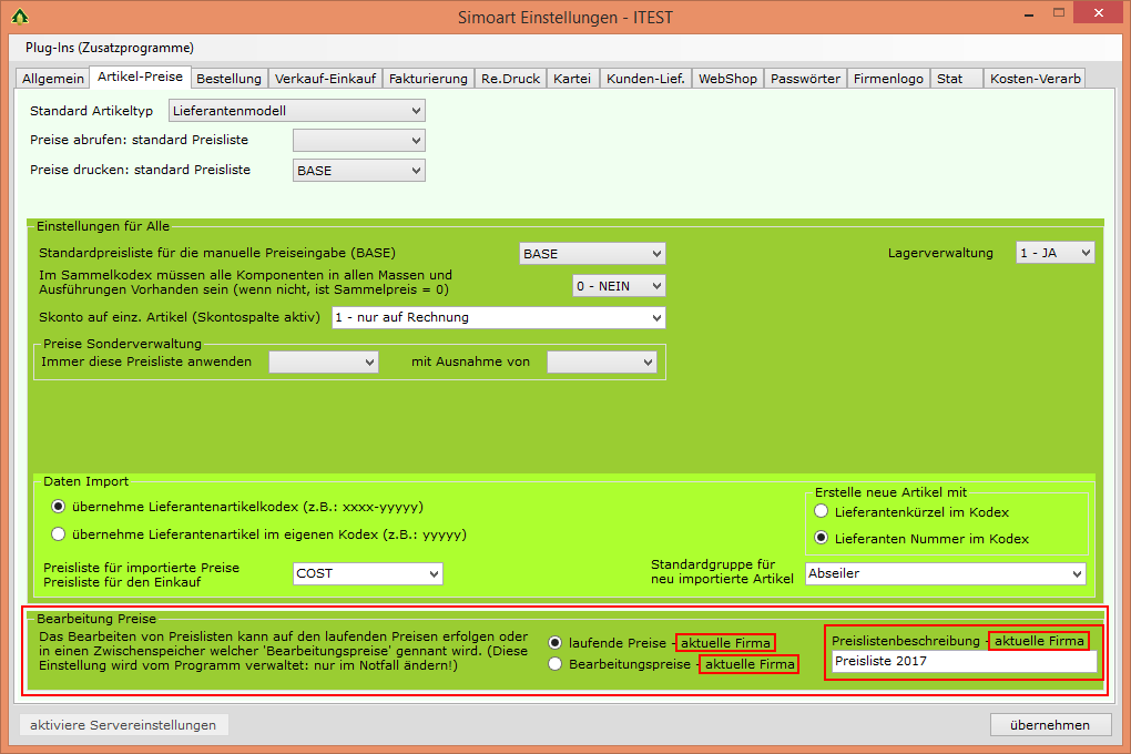 Die Funktion "Neue Preise" unter Preise -> Bearbeiten -> Preise Bearbeiten ist nun für mehrere Firmen erweitert worden. Die Funktionen "Neue Preisliste anlegen ...", "Zwischenspeicher laden" und "Zwischenspeicher entladen" beziehen sich auf die gerade gewählte Firma. Die Einstellungen betreffend "Bearbeitung Preise" der aktuellen Firma finden Sie im Reiter Artikel-Preise der Einstellungen. Siehe Bild