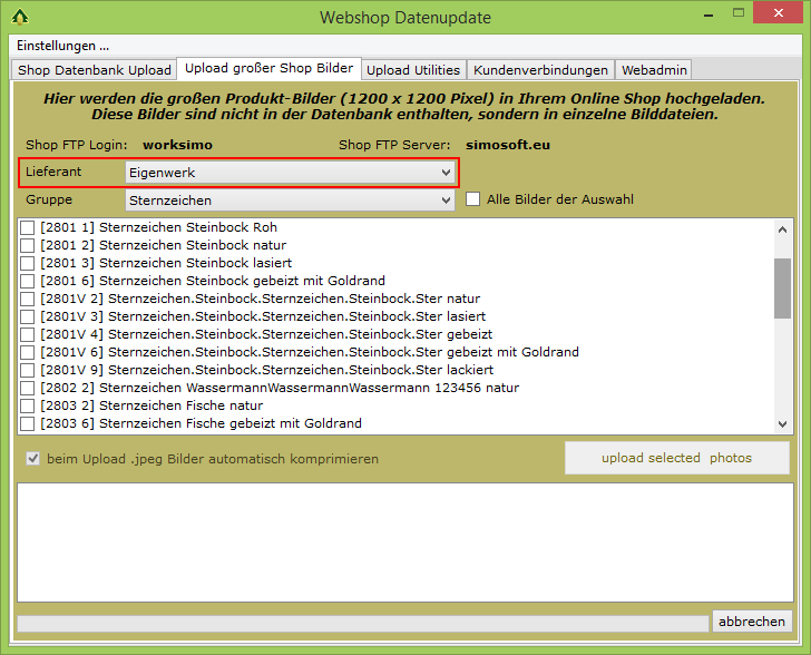 Im Bild die neue Lieferant-Auswahlmöglichkeit im Reiter "Upload große Shop Bilder" des Webshop Datenupdate Programms.
