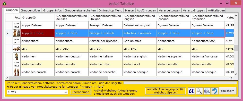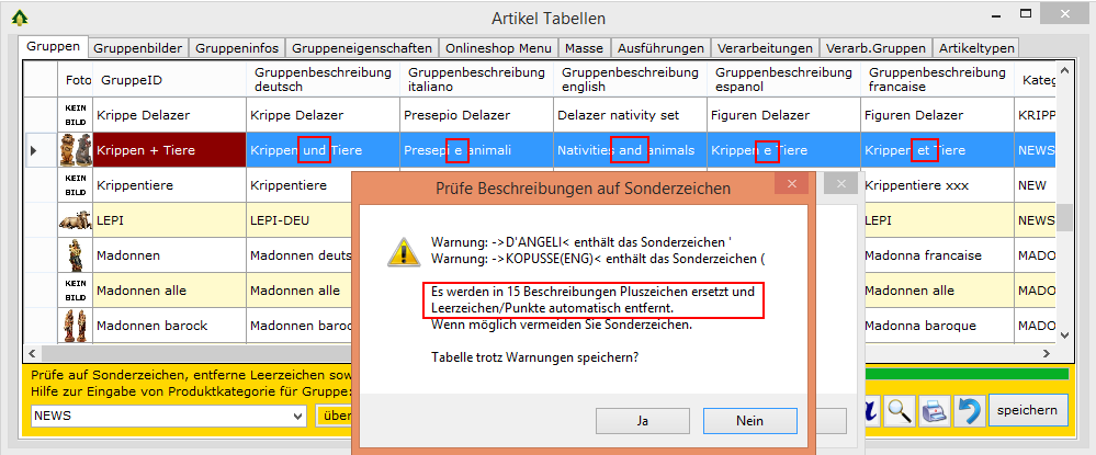 Die Beispiele beziehen sich auf Gruppenbeschreibungen, aber die automatische Ersetzung erfolgt auch auf den Kategoriebeschreibungen. Die Prüfung auf Sonderzeichen und die dementsprechende Meldung wurden ebenfalls verbessert.