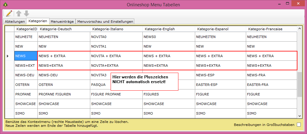 In den Einträgen der Online-Shop Menu Tabellen, erfolgt keine automatische Ersetzung der Pluszeichen(+).