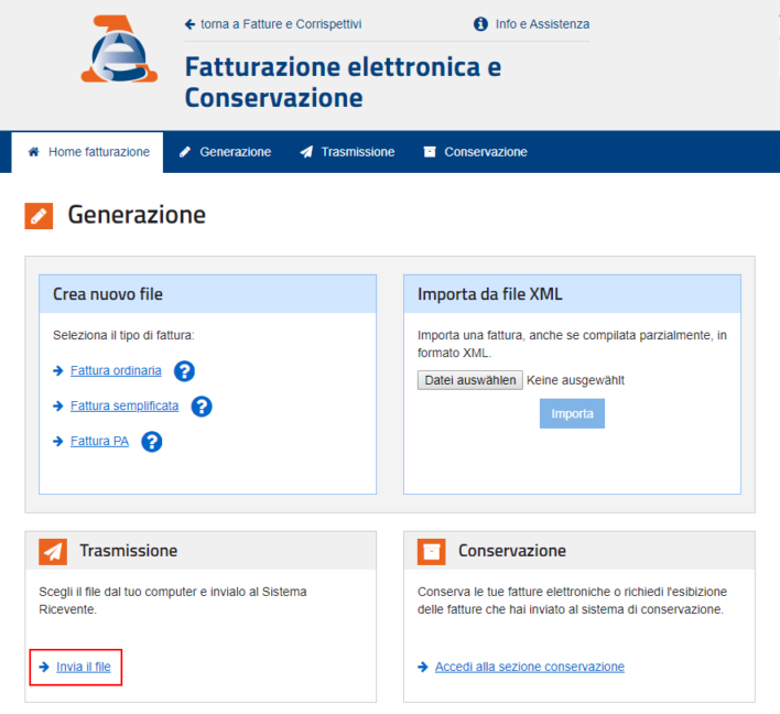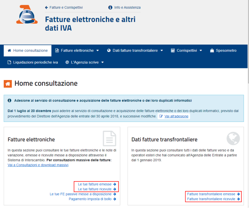 Zum Schluss wiederholen wir die Aufforderung die Zugangsdaten zur "Agenzia delle Entrate" anzufordern (Richiedi il PIN), um auf den Seiten der Agentur alle Infos über die elektronischen Eingang- und Ausgangsrechnungen zu erhalten. Hier könnten Sie Ausgangsrechnungen direkt vom eigenen PC hochladen und Eingangsrechnungen auf Ihrem PC herunterladen. Somit haben Sie die komplette Kontrolle über Ihre elektronischen Rechnungen. Anbei zwei Screenshot der Seiten der Agentur zum Up- und Download der elektronischen Rechnungen.