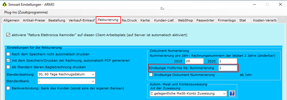 Für Proforma-Rechnungen wurde eine eigene eindeutige Nummerierung programmiert. Diese neue Nummerierung beginnt standardmäßig mit 1. Wenn Sie die Startnummer der Nummerierung selbst bestimmen wollen, können Sie das jederzeit in den Einstellungen tun - siehe Bild.