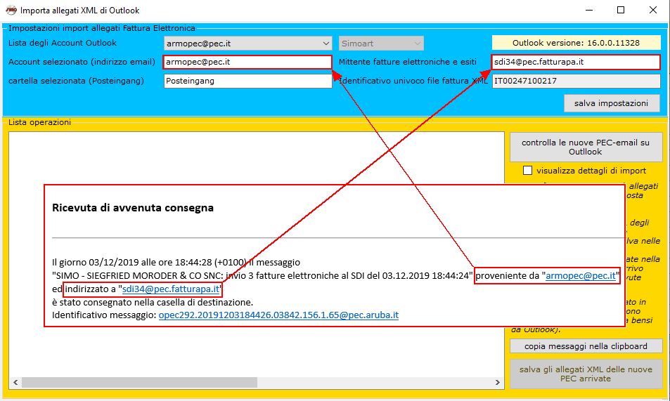 Damit die Mitteilung-Emails der Übermittlungen der Rechnungen an das SDI (ACCETTAZIONE und CONSEGNA) verschoben werden können, müssen folgende Übereinstimmungen gegeben sein: Emailadresse "proveniente da" = Emailadresse "Account selezionato" und Emailadresse "indirizzato a" = Emailadresse "Mittente fatture elettroniche e esiti" - siehe Beispiel im Bild. Weitere Infos zu Outlook-Import