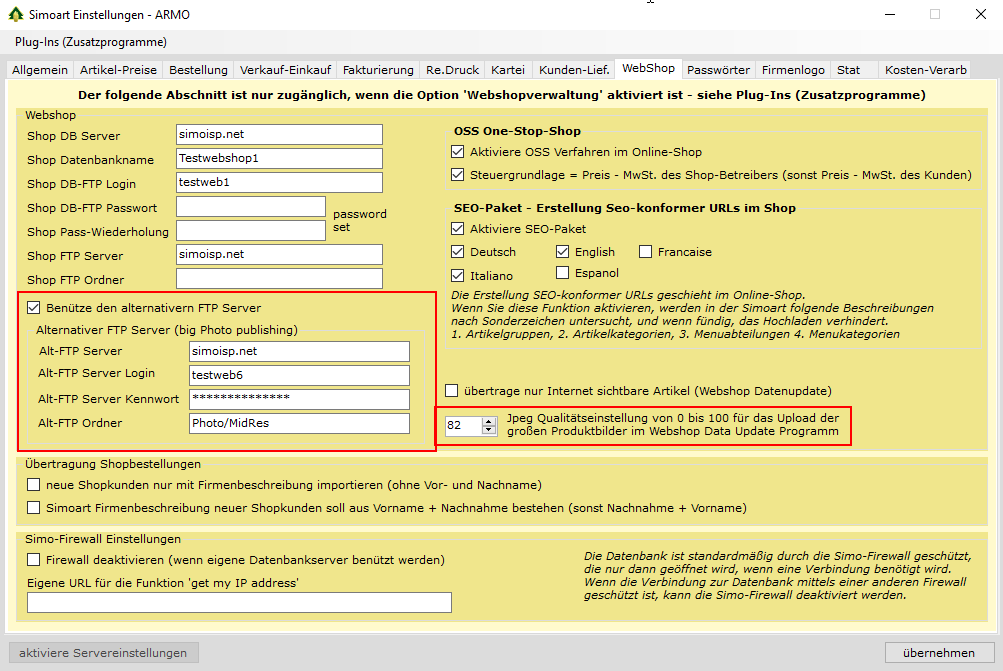 Für alle Simoart Benutzer, die keinen Online-Shop, aber möglicherweise eine Website betreiben, wurde die Möglichkeit geschaffen die eigene Webseite für das Speichern der großen Produktbilder zu nutzen. Dazu wurde in der Simoart ein alternativer FTP Server eingerichtet. Um den alternativen FTP Server zu nutzen, müssen Sie ihn zuerst in den Einstellungen anlegen - siehe Bild unten.