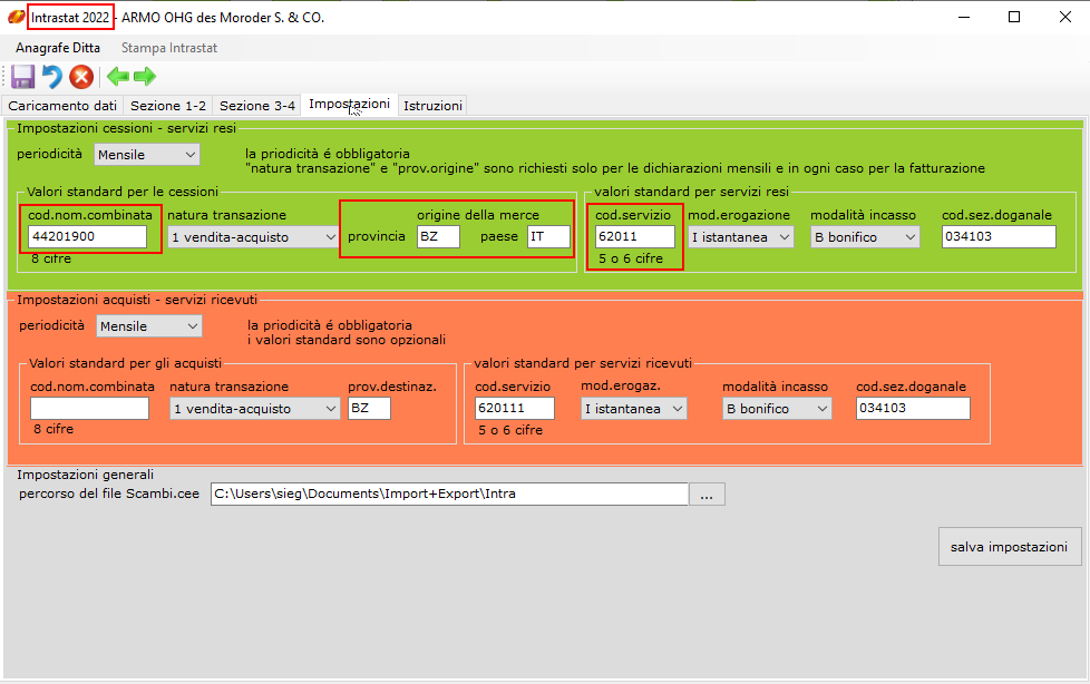 Beginnen Sie mit den Intrastat-Einstellungen. Hier muss "cod.nom.combinata" wie oben beschrieben geändert werden. Auch für die Leistungen wurden die Kodexe geändert: diese Kodexe sind zum Großteil auf 5 Stellen reduziert worden. Hinzugekommen ist das Feld "paese" welches für "Codice del paese di origine della merce" steht. Für dieses neue Feld gilt folgende Verordnung: