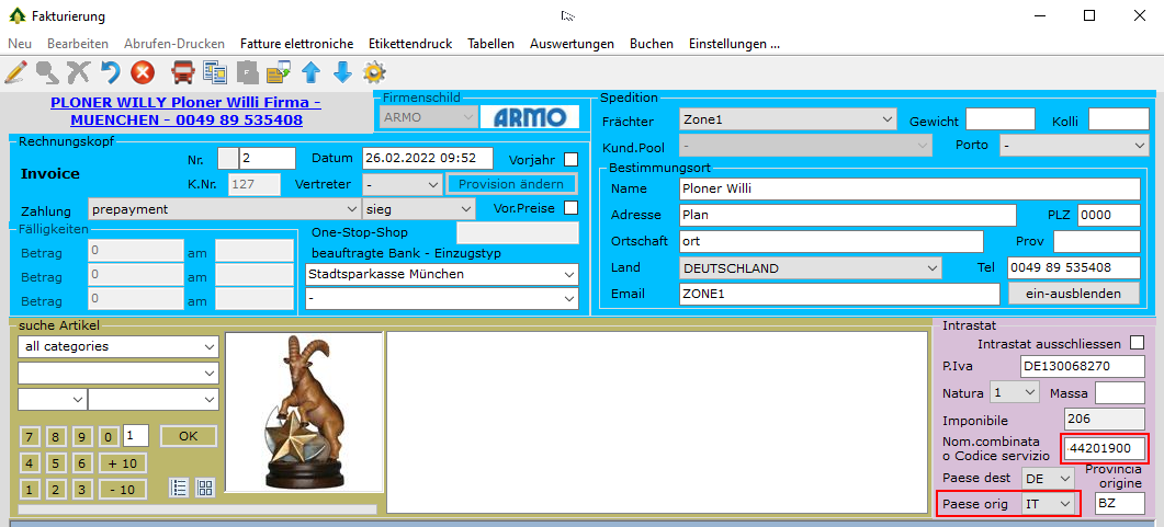 Nachdem Sie die Intrastat-Einstellungen gespeichert haben, öffnen Sie die Fakturierung. Auch dieses Programm ist von den Intrastat-Änderungen betroffen - siehe Bild. Auch wenn Sie die Rechnungen vom Januar 2022 händisch im Intr@Web Programm mit den neuen Kodexen für "nomenclatura combinata" eingegeben haben, raten wir alle betroffenen Rechnungen auch in der Fakturierung richtig zu stellen. Stellen Sie auch das neue Feld "Paese orig" ein.