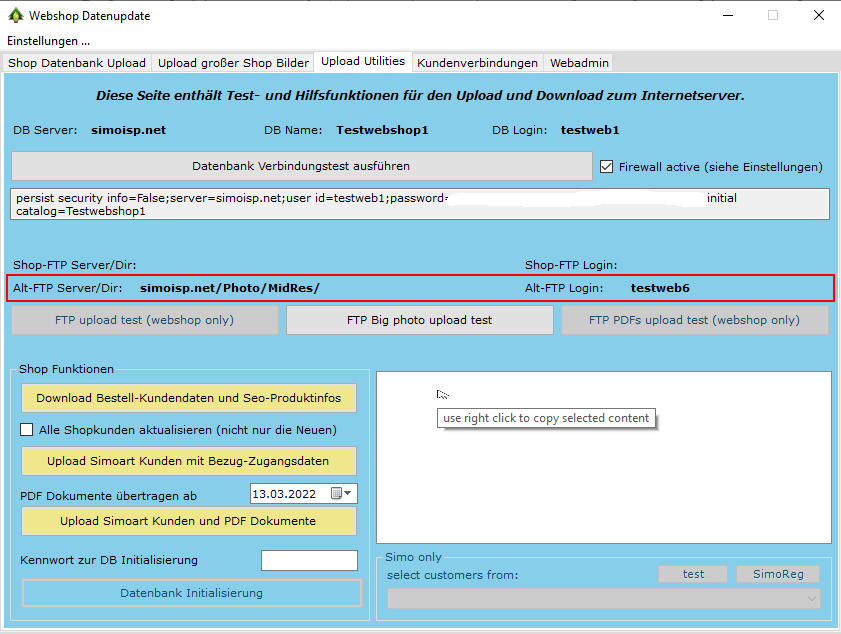 In Folge der oben beschriebenen Änderungen, wurde das "Upload Utilities" Programm aktualisiert - im Bild, siehe den neuen alternativ Server Eintrag. Sehen Sie auch die klare Trennung zwischen den Datenbank- und den FTP Zugangsdaten Einstellungen.